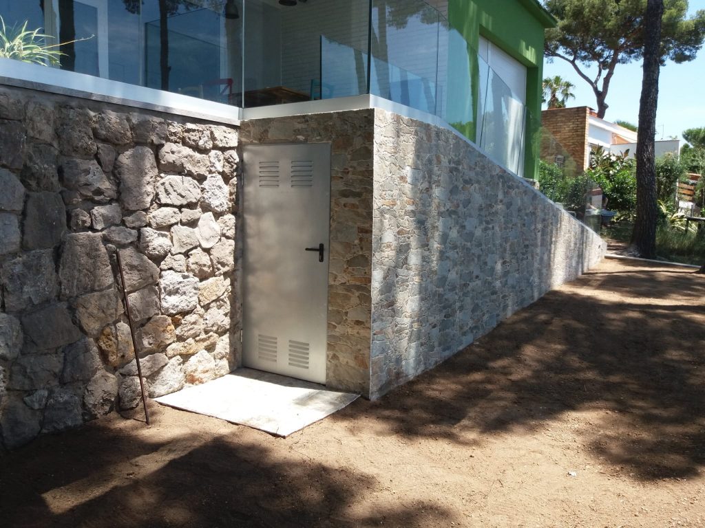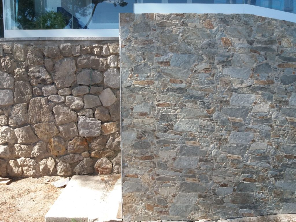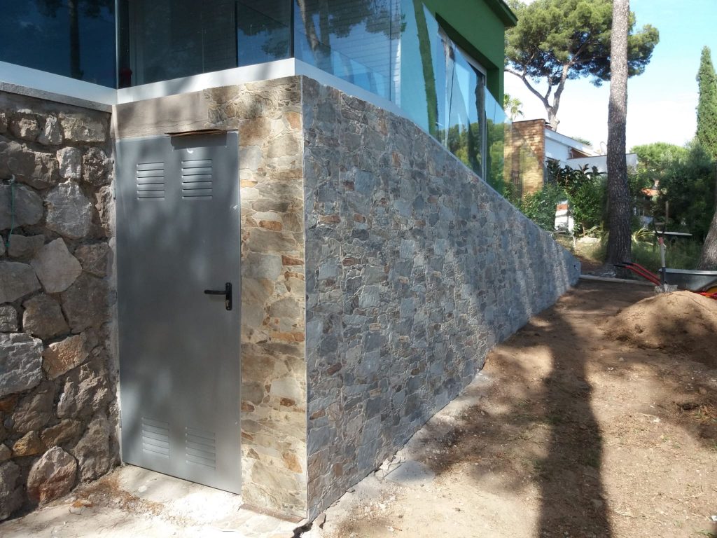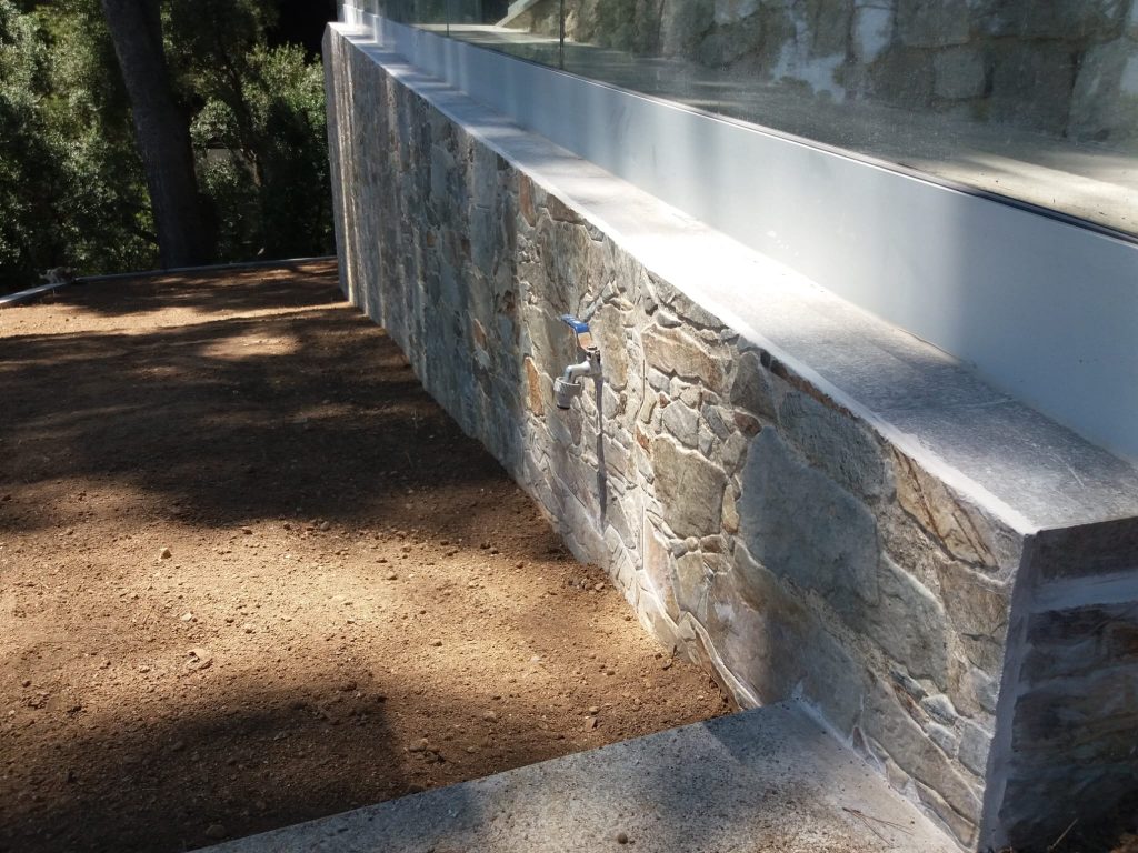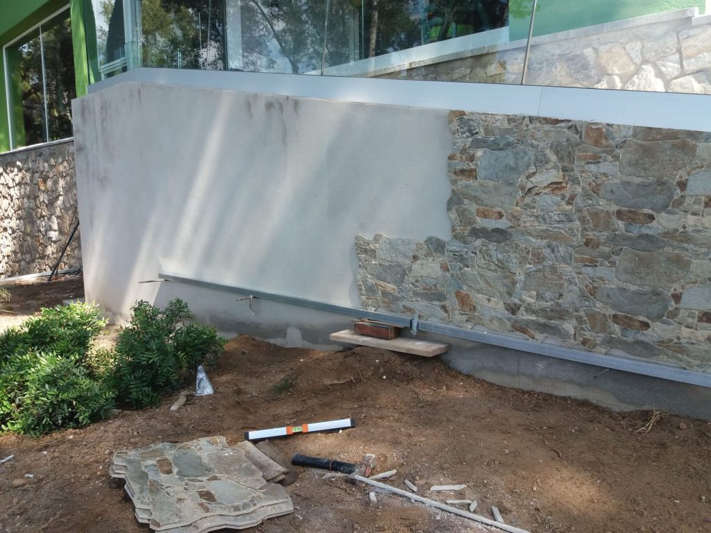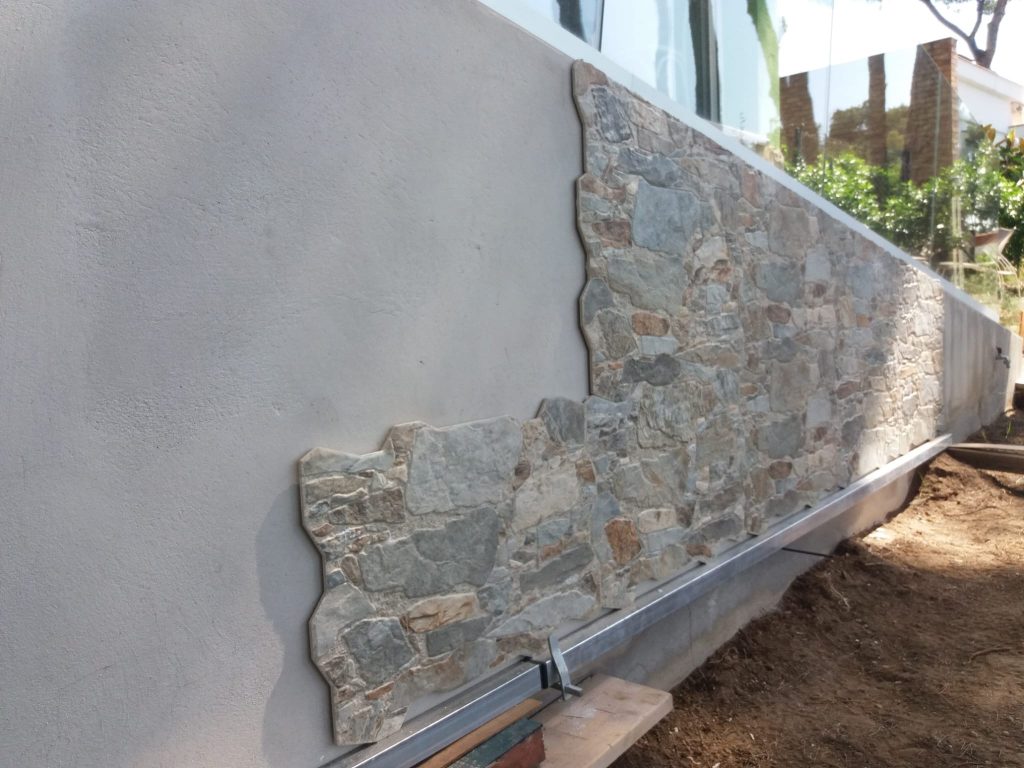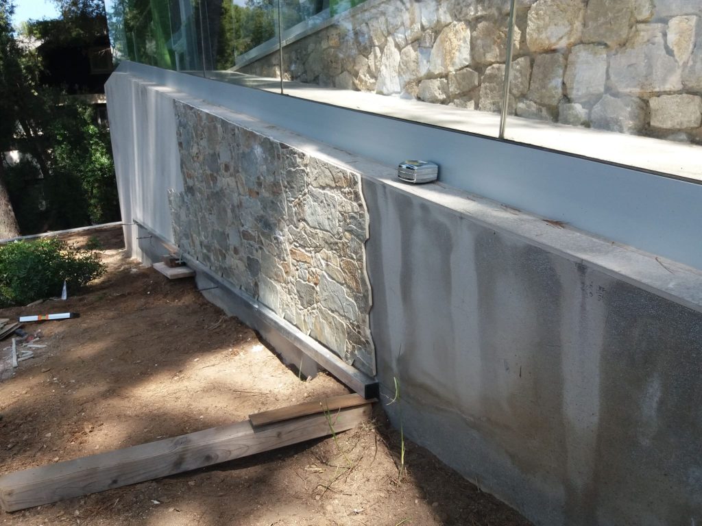 En las imágenes se aprecia el contraste entre el muro liso original y la zona revestida con piedra natural, mostrando claramente la diferencia estética y constructiva.